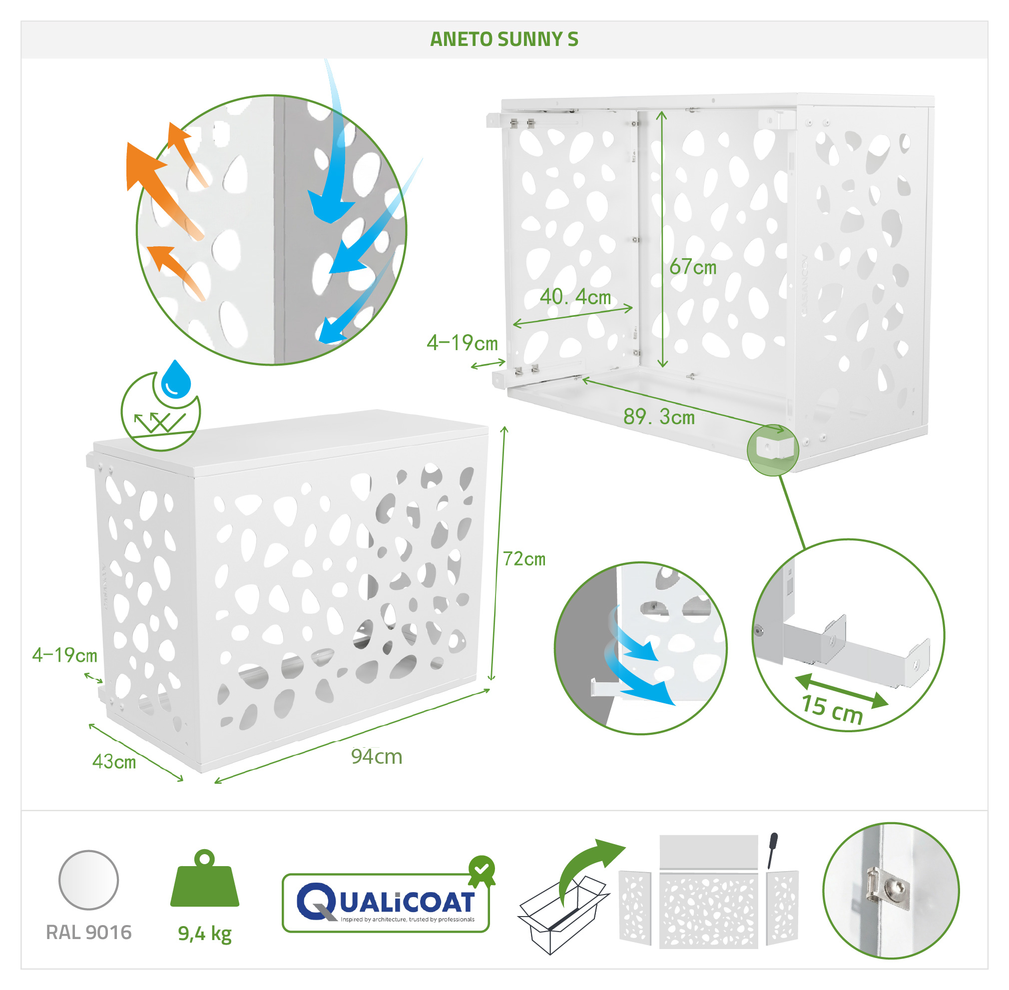 Nykyaikainen kivikuviointi antaa Aneto Sunny alumiiniselle ilmastointilaitteen suojalle hienostunutta tyyliä ulkoasuusi. Alumiinirakenteensa ansiosta se on kevyt ja samalla erittäin kestävä. Yläpinnan integroitu vahvistuspalkki jäykistää koko rakennetta, mikä varmistaa suuremman vakauden ja optimaalisen kestävyyden, ja se sopii erityisesti seinäasennukseen pohjapaneelin kanssa.