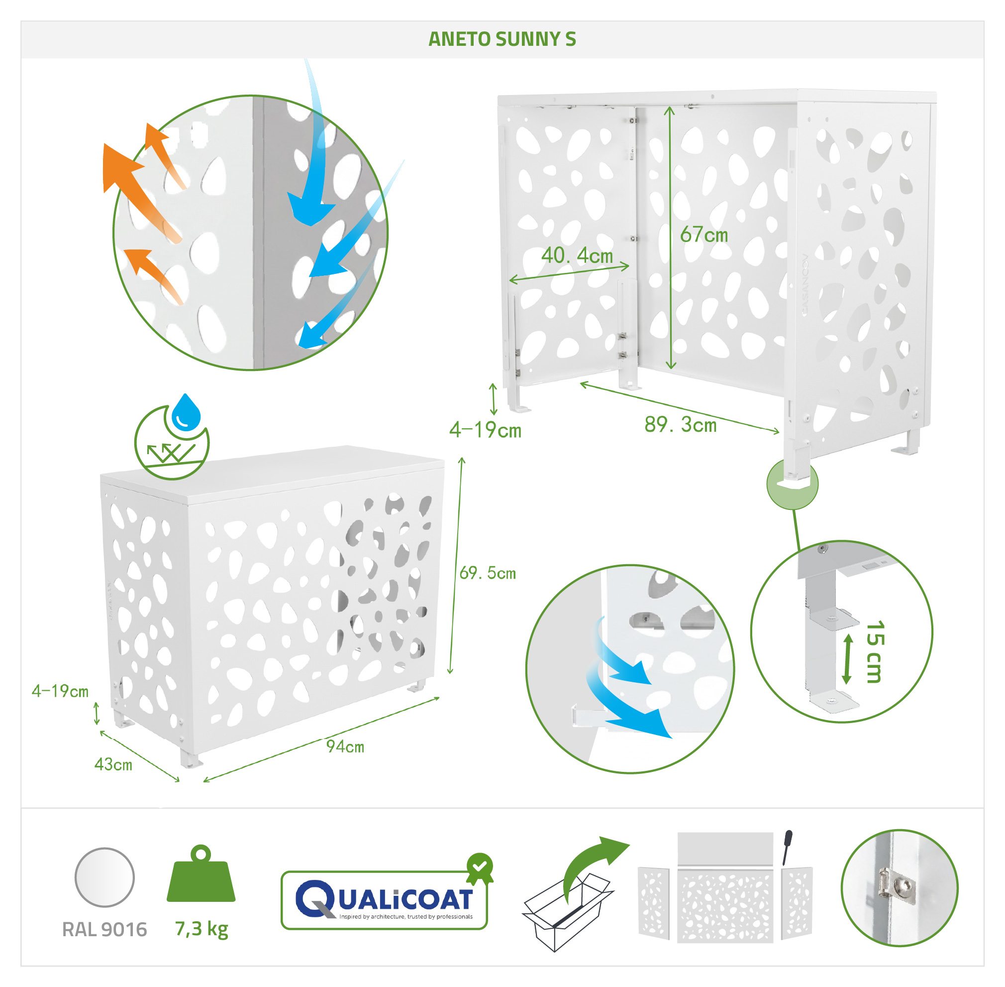 Perfect for protecting your air conditioning unit while preserving the visual harmony of your facade, this air conditioner cover combines design and robustness. Its openwork design allows air to circulate freely while elegantly concealing your technical installation. A modern, aesthetically pleasing, and practical air conditioner/heat pump cover, designed to enhance your exterior design without compromising on quality.