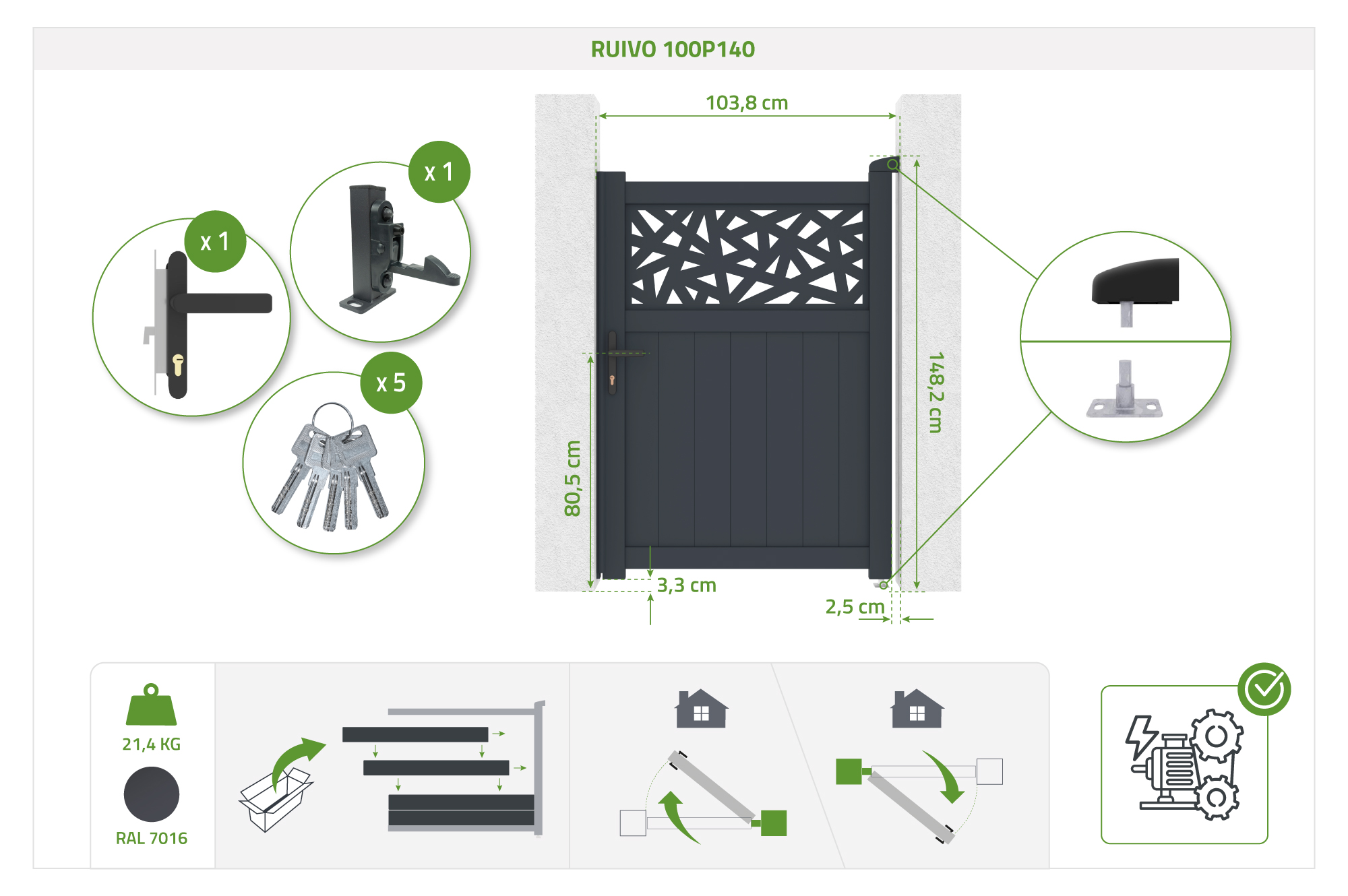 Kaikki portaalisi asennukseen tarvittavat lisävarusteet toimitetaan sinulle, ja kaikki, mitä portaaleihimme sisältyy, on määritelty tuotteen teknisissä ominaisuuksissa sekä kuvauksessa.